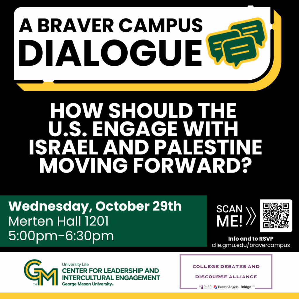 The Center for Leadership and Intercultural Engagement is partnering with Braver Angels, Bridge USA, and the American Council of Trustees and Alumni to host our very own A Braver Campus Series. This series includes education and programming focused on increasing understanding across difference. Opportunities will take place in a variety of formats including workshops, dialogues, 1:1 conversations, and debates.