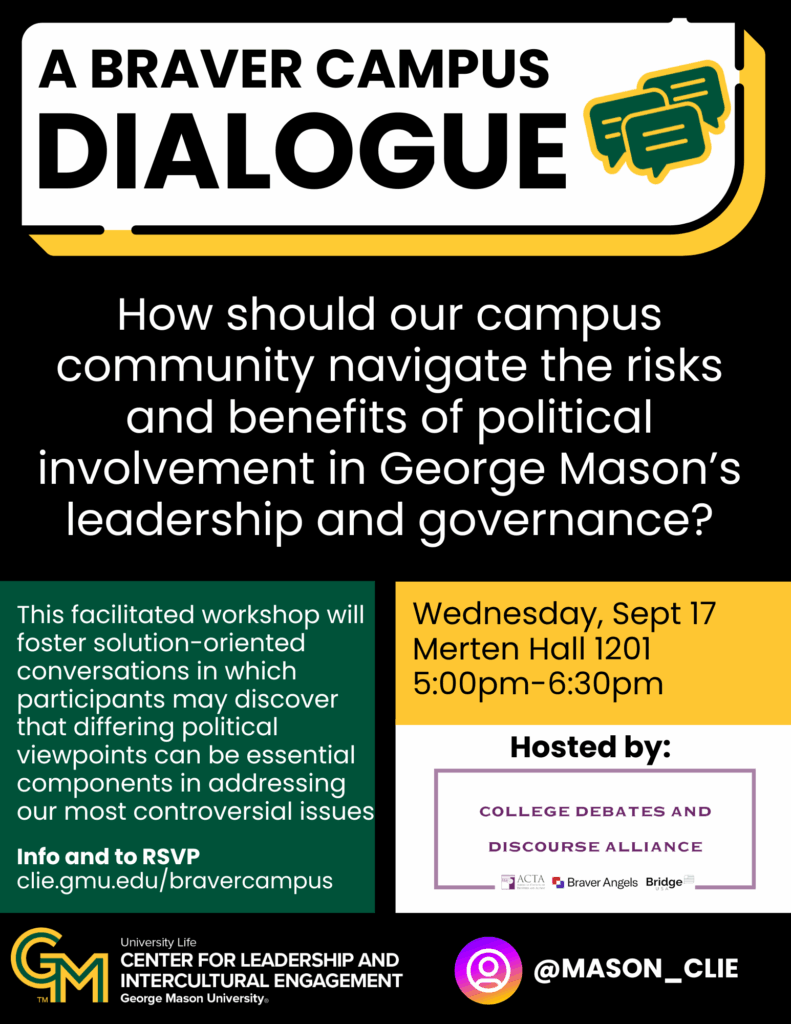 Topic: How should our campus community navigate the risks and benefits of political involvement in George Mason’s leadership and governance?