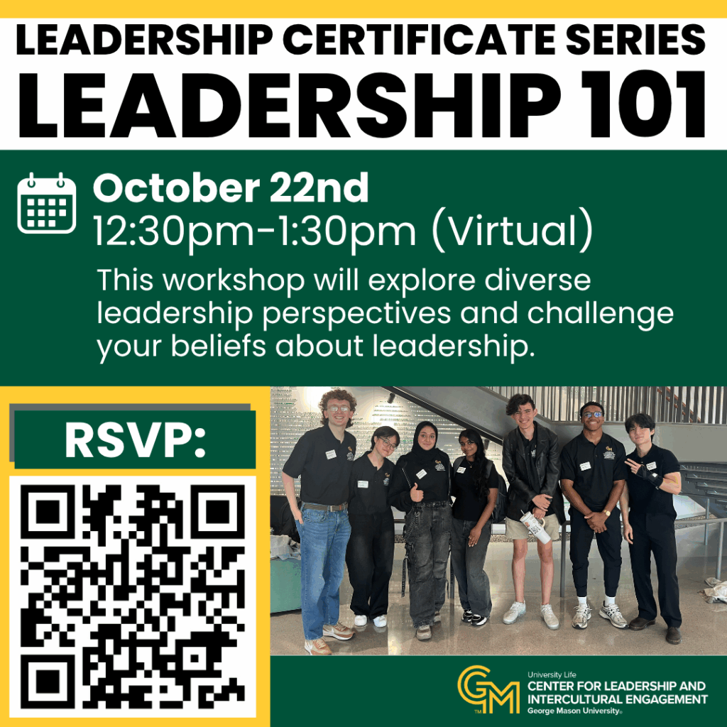 The Leadership Certificate Series is a virtual program open to Mason students, faculty, staff, and alumni. Participants will explore their personal leadership values, develop skills in emotional intelligence and team collaboration, and learn how to lead with purpose and impact. Through interactive sessions and a supportive cohort model, this series offers opportunities to connect with others, reflect on strengths, and grow as a confident, socially conscious leader.