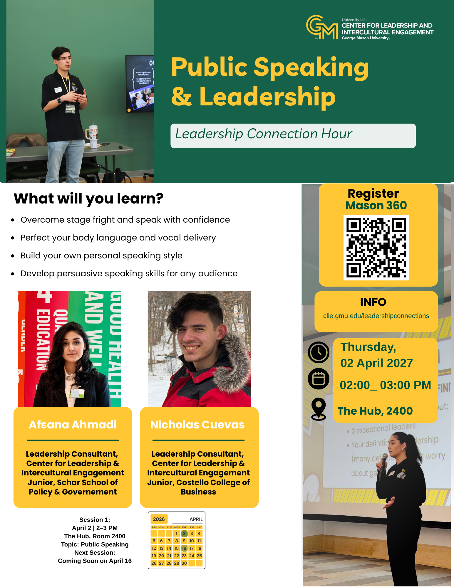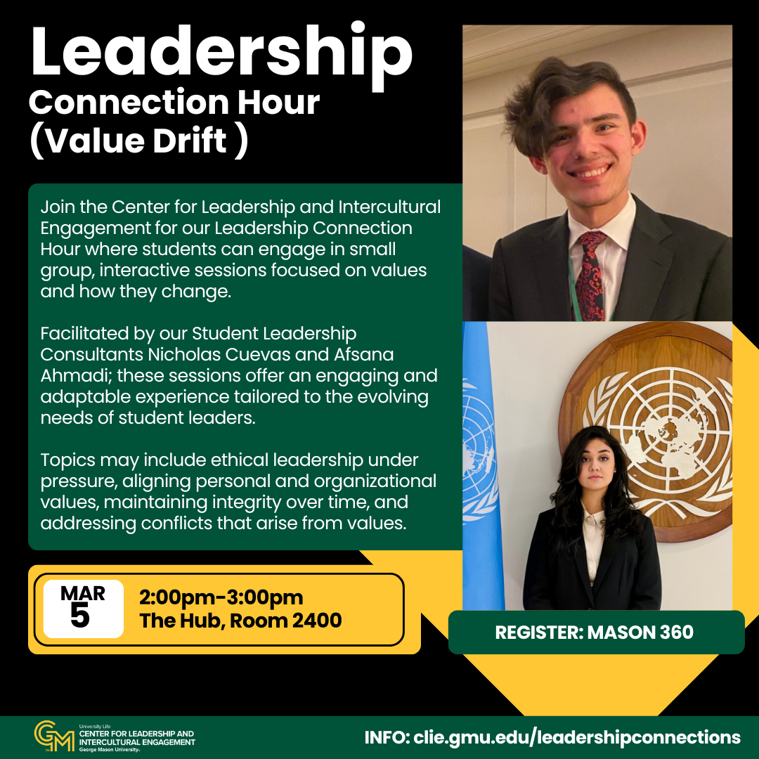NOTE: Leadership Connection Hours are designed for a smaller group of participants. We are able to accommodate a maximum of 16 participants for each session. Be sure to register via Mason 360 ahead of time