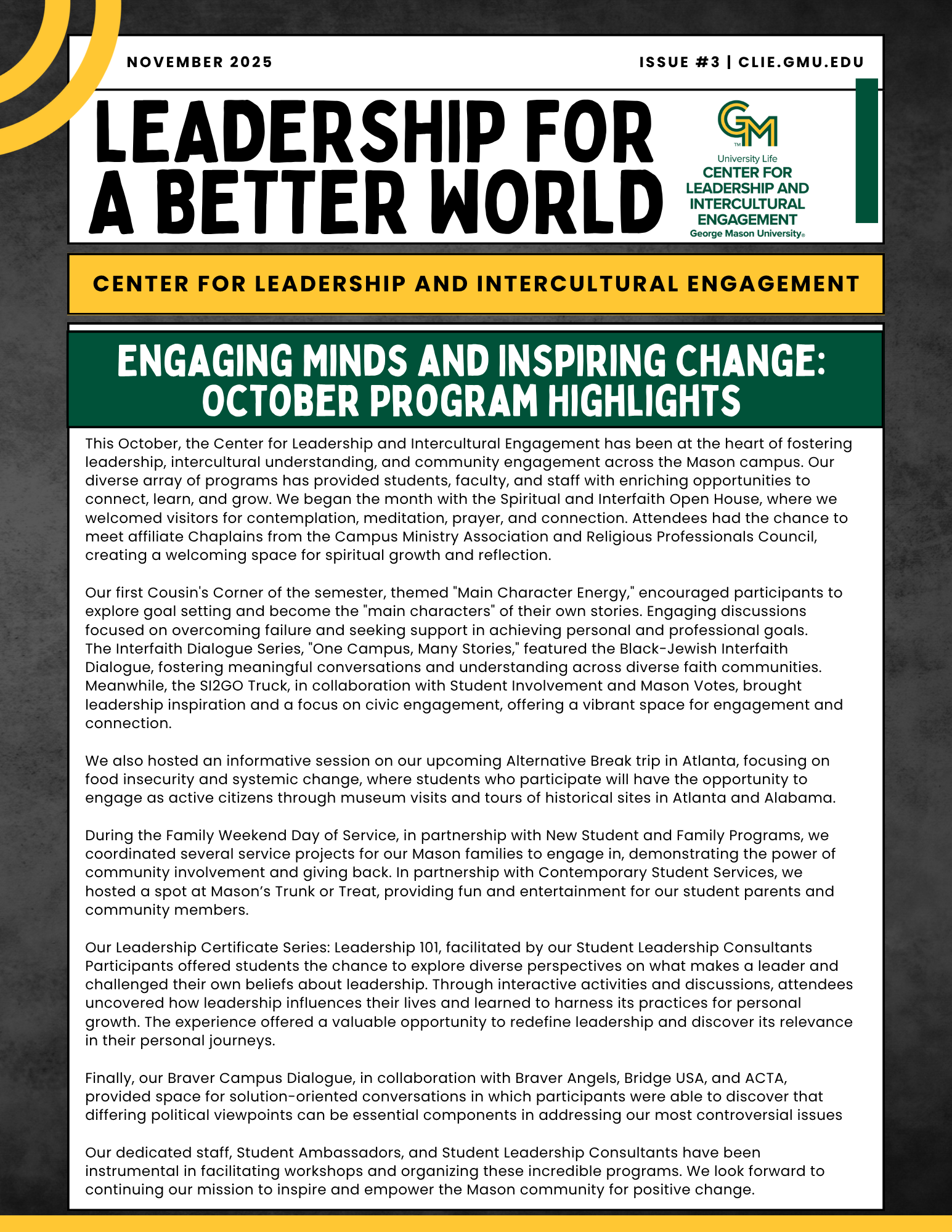 We are excited to announce the launch of our new newsletter, a vibrant platform dedicated to sharing the impactful work happening at the Center for Leadership and Intercultural Engagement. This newsletter will serve as a window into our initiatives, spotlighting the dynamic programs, inspiring stories, and transformative projects that embody our commitment to leadership, intercultural understanding, and positive change. Join us on this journey as we explore innovative ways to empower individuals, build global coalitions, and create a legacy of respect and empowerment for all. Stay connected with us to learn more about how we are fostering a world where everyone is valued, respected, and inspired to lead.